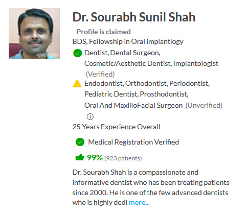 Charudatta Shah2025-10-01Trustindex verifies that the original source of the review is Google. Excellent fitting of denture, very good advice, personal attention and reasonable cost. Thanks Dr. Sourabh Shah. Chandrakant Pardeshi2025-09-26Trustindex verifies that the original source of the review is Google. One of the best dentist Rupali Thakur2025-09-08Trustindex verifies that the original source of the review is Google. It was a great pleasure to get my dental treatment from Dr Sourabh Shah. I’m extremely satisfied with the entire treatment which included a few root canals, a few implants and the aligners ( Invisalign). I had a time crunch as I was supposed to go back to Canada & he completed the entire treatment as per the given timeline. Everything was planned well and implemented to the perfection. I am very happy with my smile and I’m not facing any problems in Canada despite operating the aligners on my own. The entire staff of Happy Smiles Dental clinic is very welcoming and supportive. I would 100% recommend this clinic for anyone having any kind of dental issues be it minor or major. Thank you! 😇 Hemal Gandhi2025-09-02Trustindex verifies that the original source of the review is Google. My daughter’s tooth extraction recently was very smooth. Dr Sourabh Shah provided honest advice and perfect treatment plan. We have been visiting Dr Sourabh Shah’s HappySmiles Dental Clinic since many years for all our family members. I recommend this clinic for anyone needing trustworthy dental care.Google rating score: 4.9 of 5, based on 144 reviews